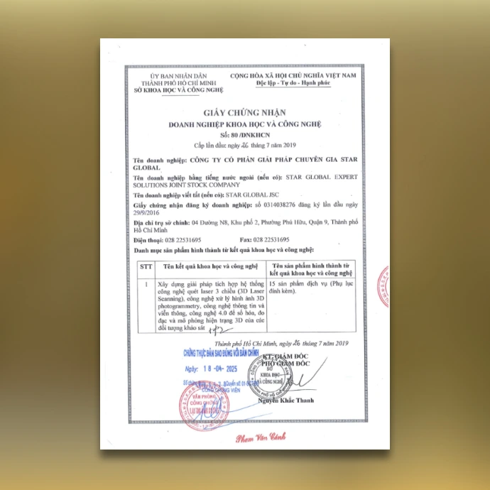 Ngoài việc triển khai ứng dụng và cung cấp dịch vụ quét 3D với các giải pháp như Trực quan hóa 3D, Khảo sát 3D, Kiểm định 3D, Quản lý 3D, Thiết kế ngược 3D, Mô hình hóa 3D (Scan-To-BIM | Scan-to-CAD)… trong các lĩnh vực khác nhau như Quy hoạch, Kiến trúc, Xây dựng, Công nghiệp, Dầu khí, An ninh công cộng, Bảo tồn di sản, Du lịch… thì StarGlobal 3D còn đầu tư rất nhiều vào việc nghiên cứu, xây dựng và phát triển hệ thống phần mềm đã được nộp đơn đăng ký Sở Hữu Trí Tuệ với tên gọi “HỆ THỐNG TƯƠNG TÁC THÔNG MINH BẰNG BẢN ĐỒ SỐ HÓA 3D/360 VỚI ĐẦY ĐỦ THÔNG TIN THỜI GIAN THỰC”. Giải pháp này là sự kết hợp giữa ảnh 360 và đám mây điểm 3D có tọa độ (x,y,z) cho phép đo được kích thước chính xác của bất kỳ vật thể nào trong không gian đã được số hóa 3D, đồng thời khả năng tích hợp CSDL và thông tin đa phương tiện dưới nhiều dạng khác nhau như văn bản, hình ảnh, âm thanh, video, bản vẽ, mô hình 3D vào trong không gian đã được số hóa. Nhờ vậy nên thể hiện được trực quan toàn bộ hiện trạng của các vật thể và công trình với kích thước chính xác, màu sắc trung thực và đầy đủ thông tin thuộc tính được truy xuất một cách rất dễ dàng và tiện lợi bằng cách tương tác trực tiếp trên màn hình của các các thiết bị di động thông minh.