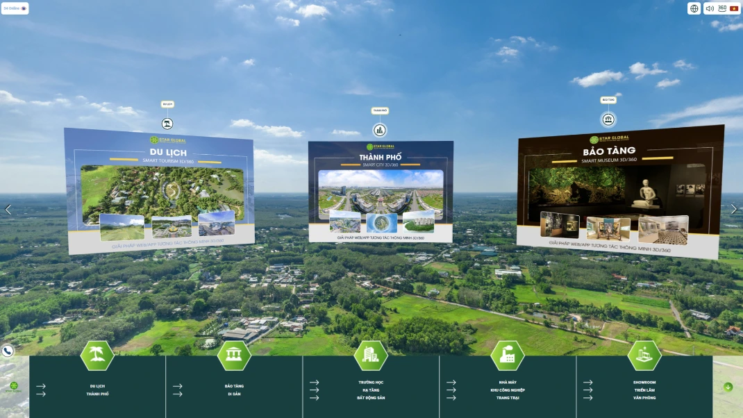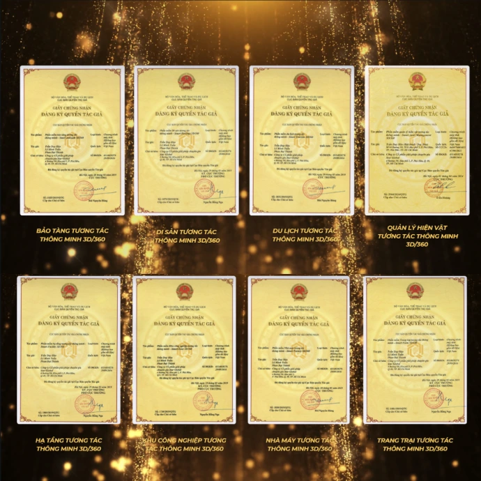 Đặc biệt là Bản sao Số Tương tác Thông minh 3D/360 này còn cho phép người dùng đấu nối và tích hợp dữ liệu thời gian thực từ các cảm biến IoT như hệ thống chiếu sáng, thông số môi trường, trạng thái thiết bị, hệ thống điện, hệ thống camera quan sát… và hiển thị các dữ liệu real-time này vào môi trường số 3D để tạo ra một nền tảng tương tác thông minh 3D/360 toàn diện. Điều này giúp cho việc lưu trữ, quảng bá, giám sát, điều khiển và quản lý vận hành trở nên đơn giản, dễ dàng và hiệu quả hơn bao giờ hết. StarGlobal 3D đã đươc Sở Khoa học công nghệ TPHCM cấp chứng nhận Doanh nghiệp Khoa học Công nghệ và đã được Cục Bản Quyền Tác Giả thuộc Bộ VH-TT-DL cấp chứng nhận bản quyền tác giả đối với hệ sinh thái phần mềm tương tác thông minh như Du lịch tương tác thông minh 3D/360, Di sản tương tác thông minh 3D/360, Bảo tàng tương tác thông minh 3D/360, Nhà máy tương tác thông minh 3D/360, Khu công nghiệp tương tác thông minh 3D/360, Hạ tầng tương tác thông minh 3D/360, Trang trại tương tác thông minh 3D/360…